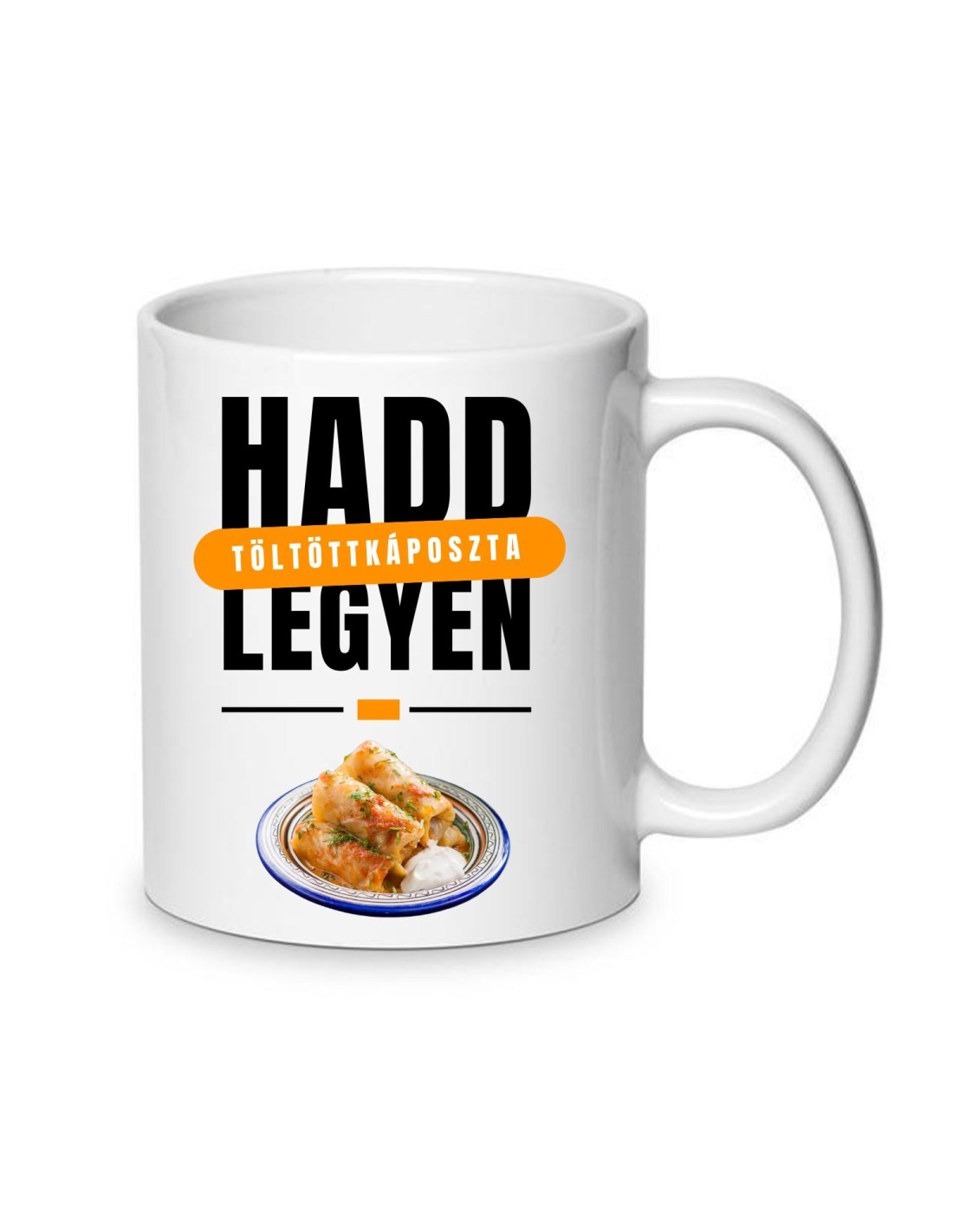 "Hadd legyen töltöttkáposzta" felirattal és képpel ellátott fehér kerámia bögre.