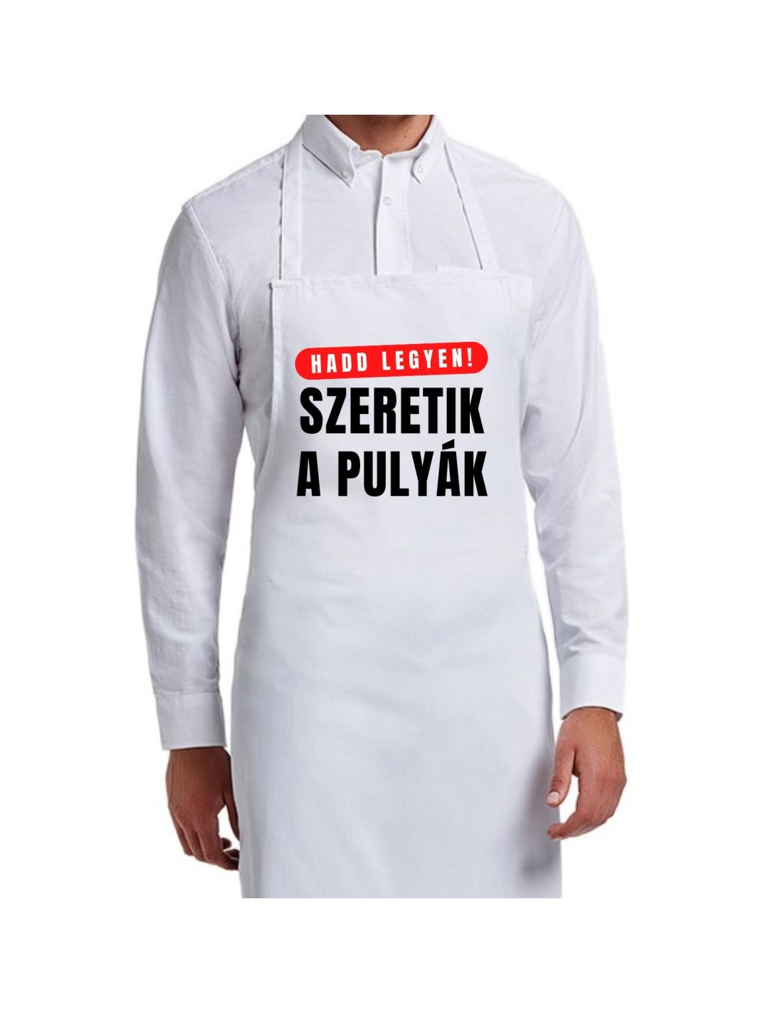 Minőségi anyagból készült "Hadd legyen töltöttkáposzta!" szöveggel és képpel ellátott fehér unisex konyhakötény, pánttal a nyak körül, hátul megköthető.