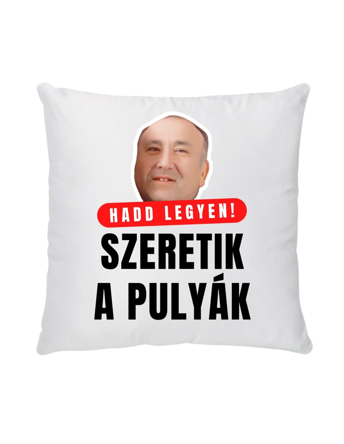 Fehér színű, "Hadd legyen, szeretik a pulyák" felirattal és arcképpel ellátott párna. Méret: 38x38, könnyen karbantartható, allergén mentes anyag. A termék huzattal és betéttel érkezik, amely cipzárral elválasztható egymástól.