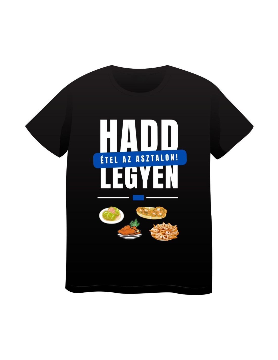 "Hadd legyen étel az asztalon!" felirattal és mintával ellátott fekete rövidujjú póló.