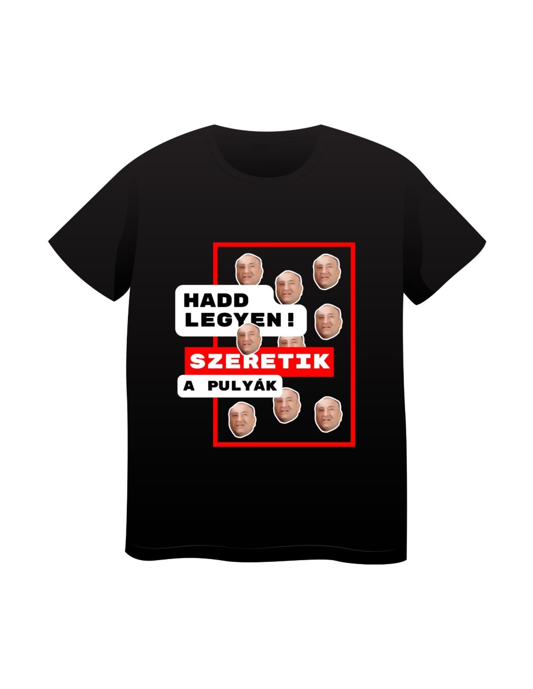 "Hadd legyen, szeretik a pulyák!" felirattal és arcképekkel ellátott fekete rövidujjú póló.